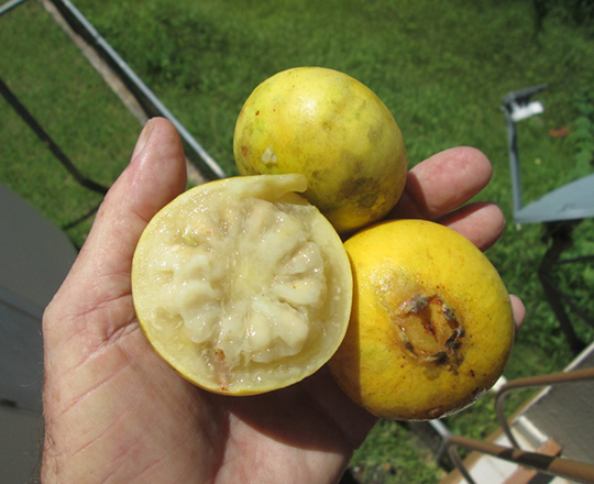 Taste: peach-apple blend. The white, pithy pulp has a pleasant odour and an agreeable, subacid flavour