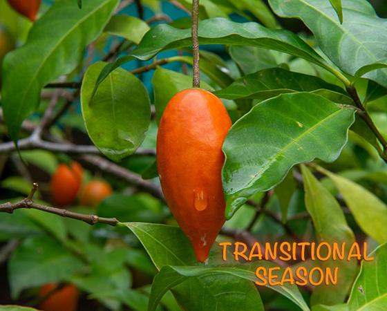 The transitional period is in between December and Februari and the month June. It is occationally raining and the average temperature is 26 degrees.